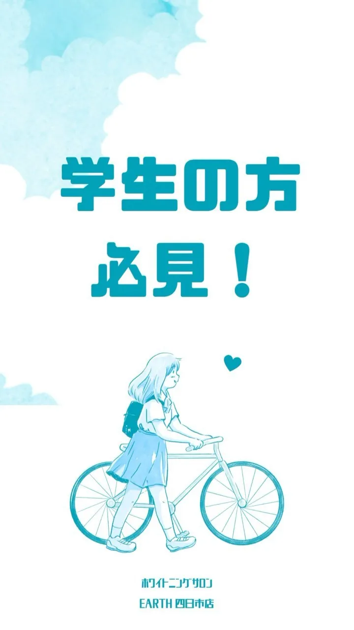 こんにちは! こんにちは!ホワイトニングサロンEARTH四日市店です🦷✨当店では、22歳以下の学生のお客様に学割クーポンをご用意しております😽とてもお得になっているので、まずは初回20分×2回照射から始めてみませんか…